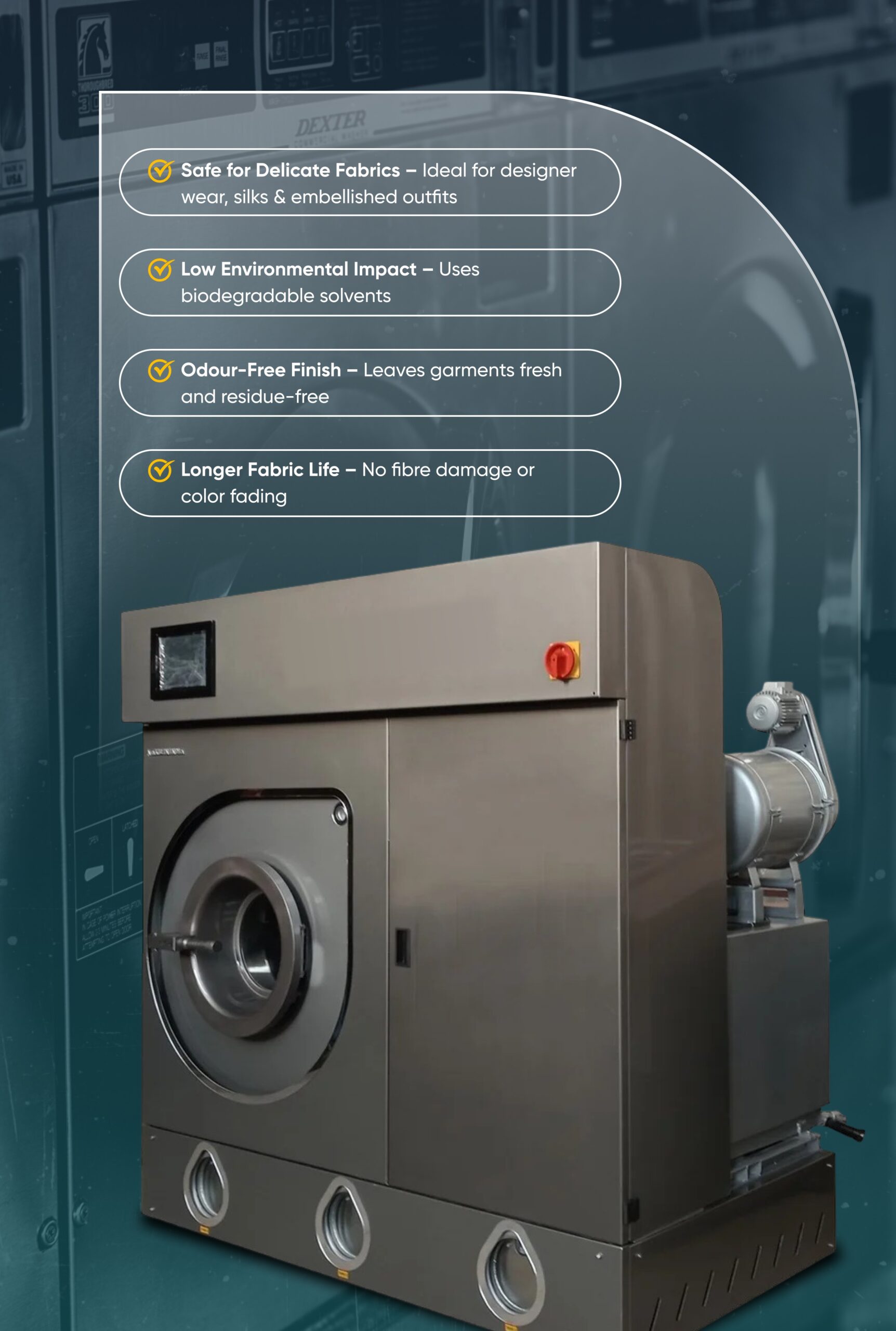 Safer for delicate fabrics, designer wear, and fine wools compared to harsher perc that can degrade fibers.
